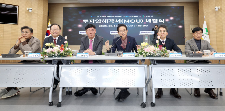 [세계타임즈=경북 한윤석 기자] 경상북도와 영주시는 15일 영주시청 강당에서 이철우 경상북도지사, 유정근 영주시장 권한대행, 임종득 국회의원, 박성만 경북도의회 의장, 김병기 영주시의회 의장, 정정모 ㈜코리아디펜스인더스트리 대표 등 20여 명이 참석한 가운데 ㈜코리아디펜스인더스트리와 경상북도·영주시 간 투자양해각서(MOU)를 체결했다.