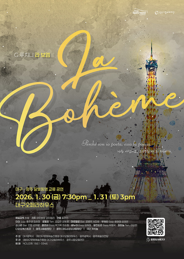 2026년 새해, 대구오페라하우스는 광주시립오페라단 제작의 푸치니 오페라 <라 보엠>을 1월 30일(금)과 31일(토) 양일간 선보일 예정이다. 이번 공연은 달구벌 대구와 빛고을 광주가 문화예술·산업·관광 등 다양한 분야에서 상생과 연대를 이어가는 광역 교류 프로젝트 ‘달빛동맹’의 일환으로 마련되었으며, 지역 간 문화 네트워크 확장과 예술교류 활성화를 목적으로 추진되고 있다.