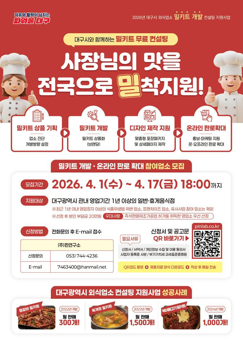 ▸ 지난해 참여업소 매출 32% 성장… 지역 맛집 자생력 강화 [세계타임즈=대구 한윤석 기자] 대구광역시는 지역 외식업소의 경쟁력을 높이고 온라인 시장 진출을 돕기 위한 ‘2026년 외식업소 밀키트 개발 컨설팅 지원사업’ 참여업소를 오는 4월 17일(금)까지 모집한다.