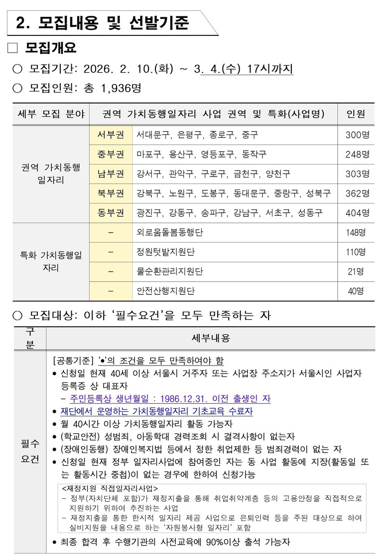 서울시가 중장년의 경험과 전문성을 사회적 가치로 전환하는「서울 중장년 가치동행일자리」사업을 올해 역대 최대 규모인 6,000개로 확대한다. 시는 이 중 1,936명을 선발하는 1차 공동 모집을 오는 2월 10일(화)부터 시작한다고 밝혔다.
