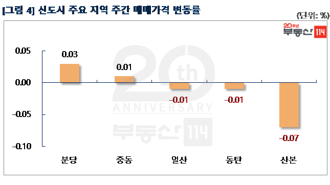 신도시는 △분당(0.03%) △중동(0.01%)은 상승한 반면 ▼산본(-0.07%) ▼동탄(-0.01%) ▼일산(-0.01%)은 떨어졌다. 분당은 최근 거래가 활발하게 이뤄진 정자동 상록우성이 500만원-1,500만원 올랐다. 중동은 중동 보람아주가 250만원 상승했다. 반면 산본은 산본동 한라주공4단지가 500만원 내렸고, 동탄은 능동 동탄푸른마을신일해피트리와 동탄푸른마을두산위브가 500만원-1,000만원 떨어졌다. 일산은 3기신도시 발표 후 시장침체가 이어지면서 백석동 힌돌1단지금호타운이 1,000만원 빠졌다.