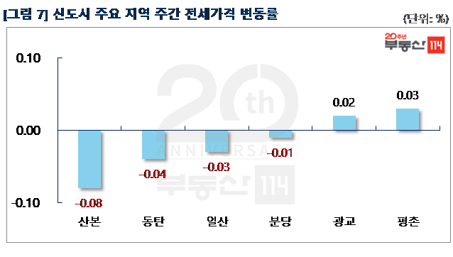 신도시는 ▼산본(-0.08%) ▼동탄(-0.04%) ▼일산(-0.03%) ▼분당(-0.01%) 순으로 떨어졌다. 산본은 송정지구 2,000여 가구 입주가 전 지역에 영향을 미치면서 산본동 한라주공4단지가 500만원 하락했다. 동탄은 능동 푸른마을포스코더샵2차가 1,500만원 내렸고, 일산은 주엽동 문촌16단지뉴삼익, 강선14단지두산이 각각 500만원씩 떨어졌다. 분당은 비수기를 맞아 거래가 정체되면서 서현동 시범한양과 효자임광이 250만원-1,000만원 하락했다. 반면 △평촌(0.03%) △광교(0.02%)는 올랐다.