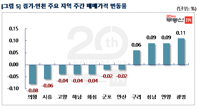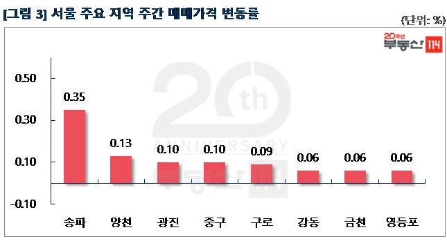 부동산114(www.r114.com)에 따르면 금주 서울 아파트가격 변동률은 0.08%를 기록했다. 재건축 아파트(0.10%)와 일반 아파트(0.08%)가 전주 대비 상승폭이 각각 0.01%p씩 낮아졌다. 신도시와 경기ㆍ인천은 지난 주와 마찬가지로 보합(0.00%)을 기록했다.