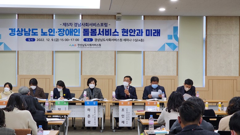 먼저 임채영 경상남도사회서비스원 수석연구원의 주제발표를 시작으로, 배화옥 경상대학교 교수, 양영자 경남대학교 교수, 조인제 도의원, 박민현 한국장애인복지협회 경남협회장, 하택근 산청시니어클럽 관장의 종합토론으로 이어졌다.