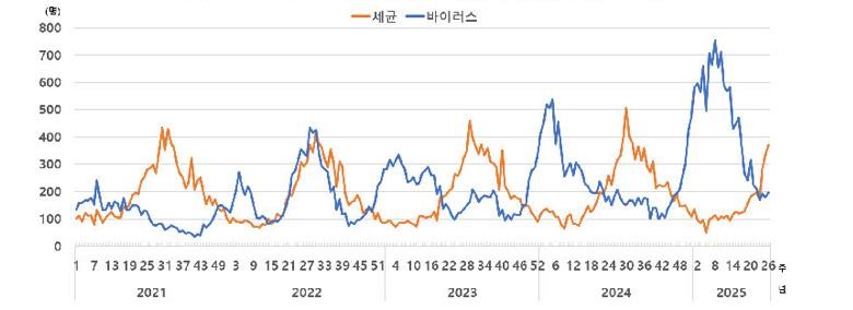 장관감염증 표본감시* 결과에 따르면, 최근 5년간(2021~2025년) 전국의 장관감염증은 증가 추세다.