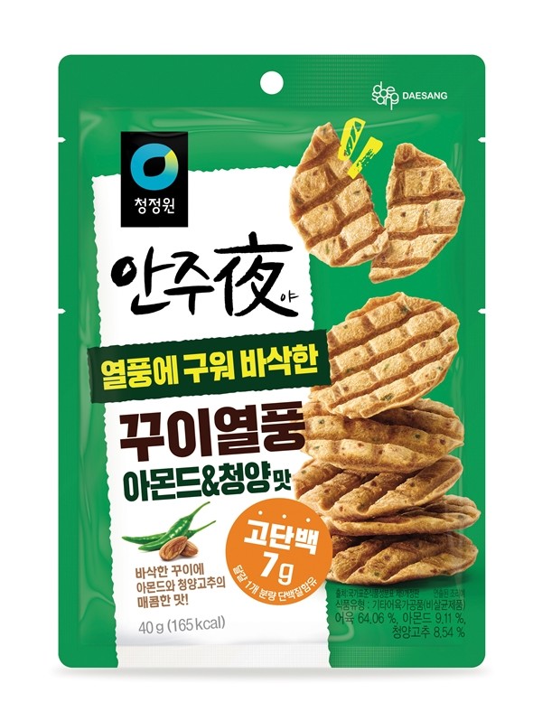 ‘안주야(夜) 꾸이열풍’ ▲아몬드맛 ▲아몬드&청양맛 2종은 한 봉지(40g)에 달걀 1개 분량의 단백질 6~7g이 함유되어 있으며, 기존 어포 관련 제품과 달리 기름에 튀기거나 당분 코팅을 하지 않고 어육을 오븐에서 열풍으로 구워내 건강과 맛을 모두 챙겼다.