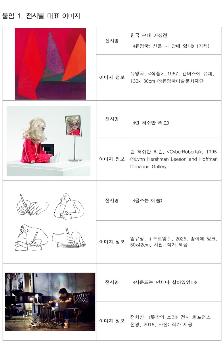 - 북서울미술관, 매체 포커스 전시《글쓰는 예술》(4월) · 국제교류전《사운드는 언제나 살아있었다》(12월)