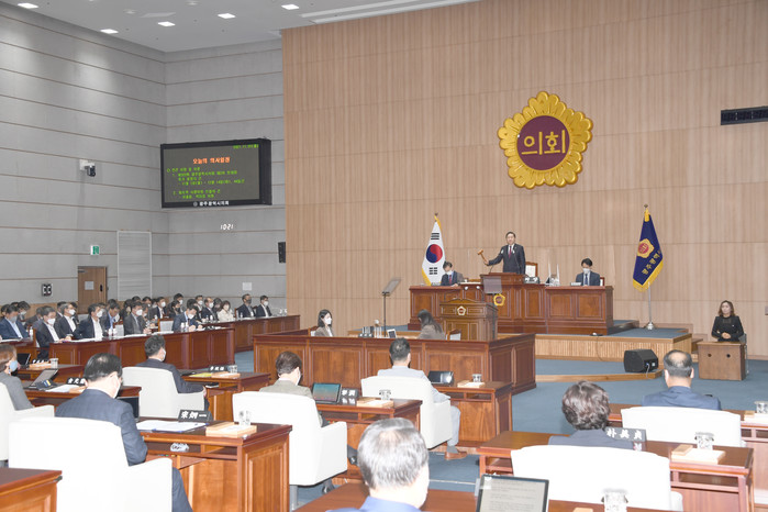 한편, 이 날 정례회에서는 ▲송형일 의원, ‘학교시설 등 주차공유제 적극 확대 필요하다!’ ▲이정환 의원, ‘시민안전실, 시민안전을 책임질 수 이도록 새롭게 거듭나야 한다!’ ▲황현택 의원 ‘광주 외부 관광객 수용 개선 방안’이라는 주제로 5분 자유발언이 이어졌다.