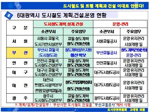 이와 함께 고 의원은 부산교통공사에서 부산 도시철도에 관한 모든 업무를 수행하는 것에 대한 문제점을 지적하고 대책방안을 제시했다.