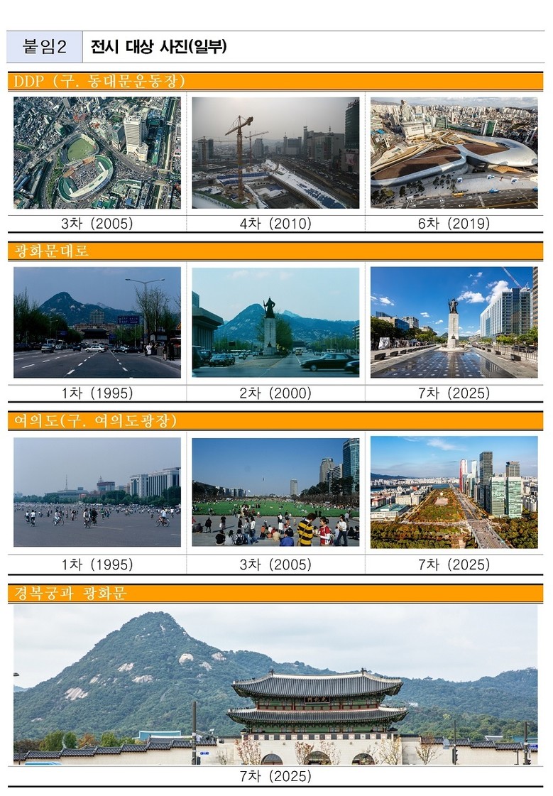 지자체 최초로 시행된 ‘경관기록화’ 사업은 1995년부터 5년 주기로 서울의 변화상을 체계적으로 기록해 온 사업으로, 도시 디자인 정책과 공간 구조의 변화, 인프라 확충 과정은 물론 시민들의 일상 풍경까지 서울의 다채로운 모습을 사진으로 기록해 왔다. 이번 제7차 사업은 이 같은 30년의 궤적을 하나의 서사로 엮어, 서울의 기억이 층층이 쌓여온 시공간을 재조명하는 데 목적이 있다.