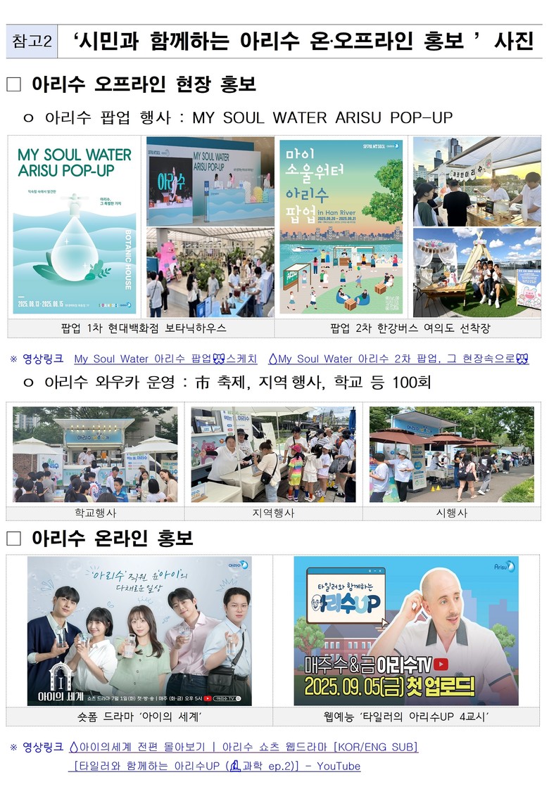 온라인에서는 스토리텔링 중심의 소통 방식을 적용했다. 방송인 타일러가 요리‧운동을 하며 아리수의 다양한 쓰임새를 보여준 웹예능과 아리수 직원들의 이야기를 담은 숏폼 드라마가 호응을 얻으며, 유튜브 아리수TV 구독자 수가 24% 증가하는 등 브랜드 호감도를 높이는 데 기여했다.