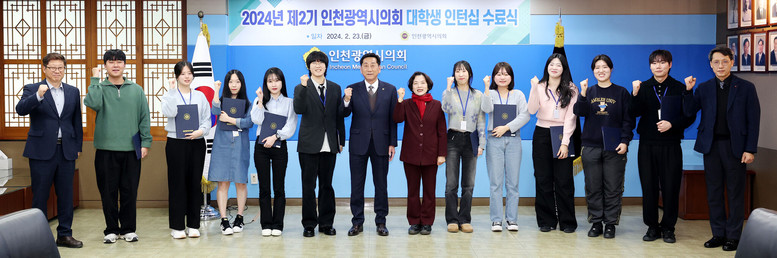 인천시의회는 지난 23일 의장 접견실에서 이봉락 의장을 비롯해 신영희 제1부의장, 김상섭 사무처장, 이상철 입법정책 담당관, 대학생 인턴 10명 등이 참석한 가운데 ‘2024년 제2기 인천시의회 대학생 인턴십 수료식을 개최했다.