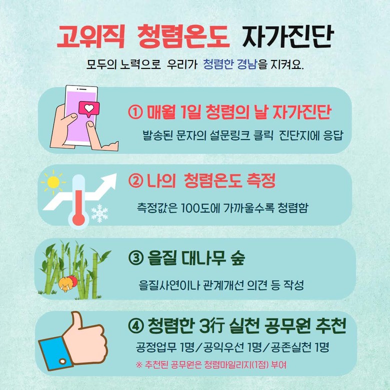 경남도는 먼저 고위직 공무원의 청렴한 조직문화 조성을 위해 ‘고위직 청렴온도 자가진단’ 제도를 도입한다. 자가진단은 경남도 소속 3급 이상 공무원을 대상으로 매월 설문 방식으로 진행되며, 청렴 취약 분야를 스스로 점검할 수 있는 체크리스트를 통해 자발적으로 청렴도를 진단하고 개선하도록 유도할 예정이다.
