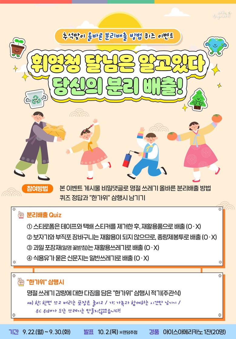 ○ (기간/ 대상) '25. 9. 22. ∼ 9. 30. / 대구시민 모두 ○ (참여방법) 대구환경이야기 블로그에 접속 → 올바른 분리배출 OX 퀴즈 정답 및 명절 쓰레기 감량 다짐을 담은 “한가위” 삼행시 댓글 남기기(https://blog.naver.com/ecocitydaegu) ○ (참여자 혜택) 20명을 추첨하여 커피쿠폰 발송 ※ 당첨자 발표일: 10. 2.(목) | ||