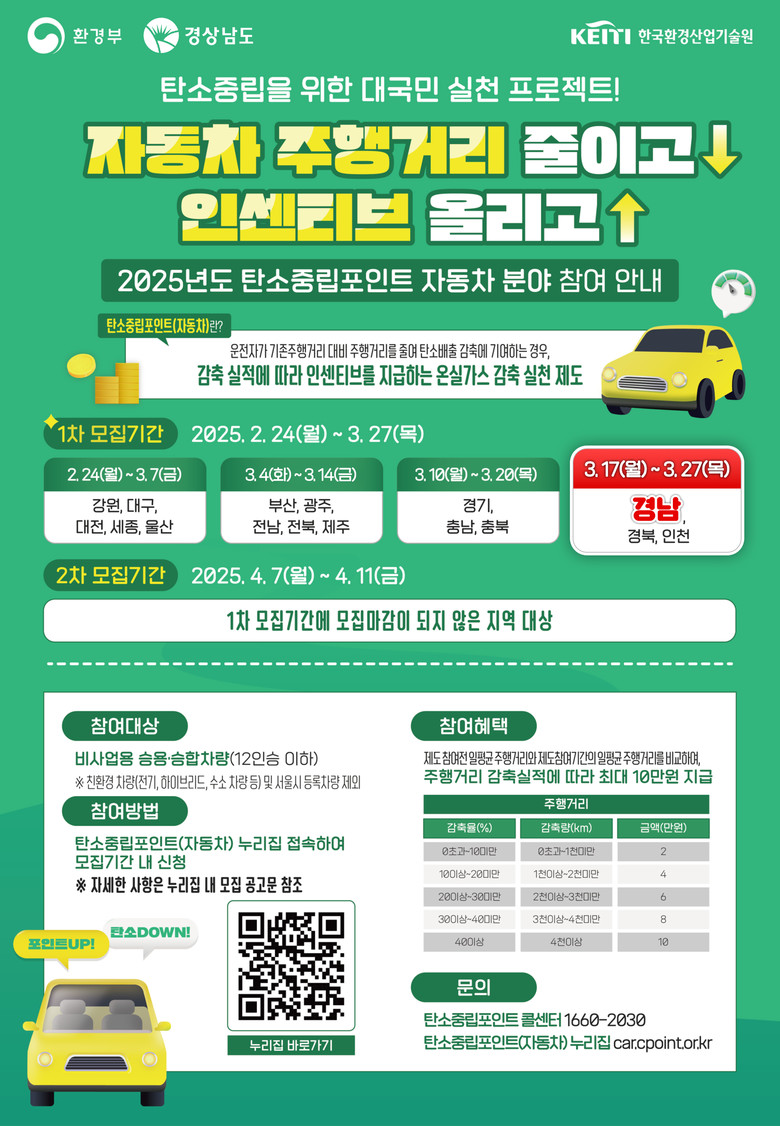 - 연간 주행거리 감축에 따라 인센티브 최대 10만 원 현금 지급 [세계타임즈=경남 최성룡 기자] 경상남도(도지사 박완수)는 3월 17일부터 27일까지 자동차 주행거리 감축실적에 따라 최대 10만 원의 인센티브를 지급하는 자동차 탄소중립포인트제를 선착순으로 모집한다고 밝혔다.