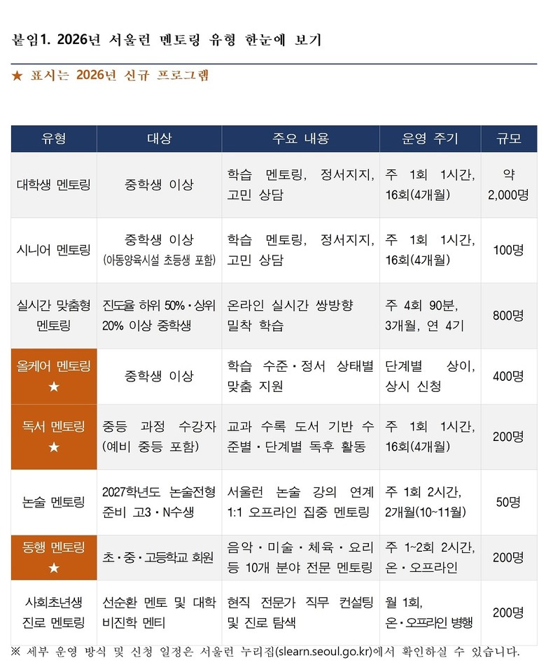 정진우 서울시 평생교육국장은 “서울런 멘토링은 단순히 성적표 숫자를 바꾸는 사업이 아니라 아이들이 스스로 삶을 설계할 수 있다는 효능감과 자신감 회복을 돕는 과정”이라며, “2026년에는 학습과 정서를 넘어 진로와 문화예술까지 아우르는 ‘통합 성장 지원 체계’를 완성할 수 있도록 역량을 집중하겠다”라고 말했다.