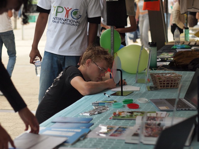 | ▲지난달20일 네덜란드 로테르담 에라스무스 대학교에서 열린 유레카위크(Eureka Week) 신입생 오리엔테이션에 참여한 학생이 IPYG부스에서 평화 메세지를 적고 있다. [사진 제공 = IPYG] |