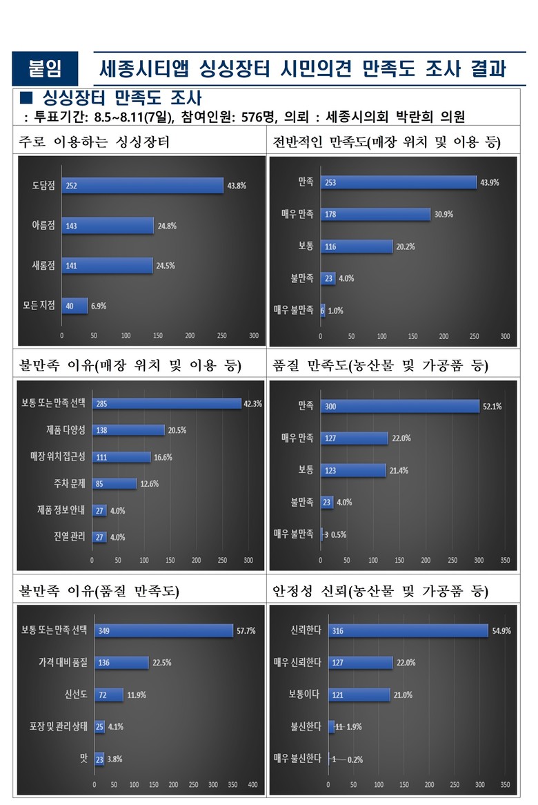 ※ 붙임. 세종시티앱 싱싱장터 만족도 설문조사 8.5~8.11(7일), 576명 시민 참여, 가격 다소 비싸다(38.5%), 매우 비싸다(2.5%) 응답 등
