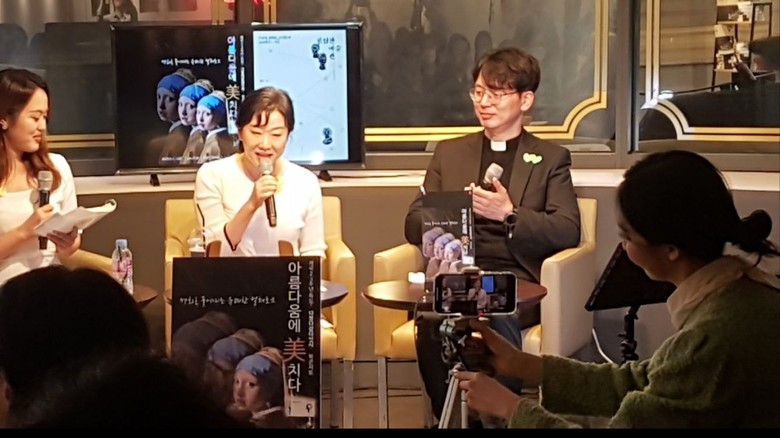 ▲북콘서트 진행 중인 이한나 아나운서, 주인공 정연은 박사 및 홍성택신부(좌로부터)