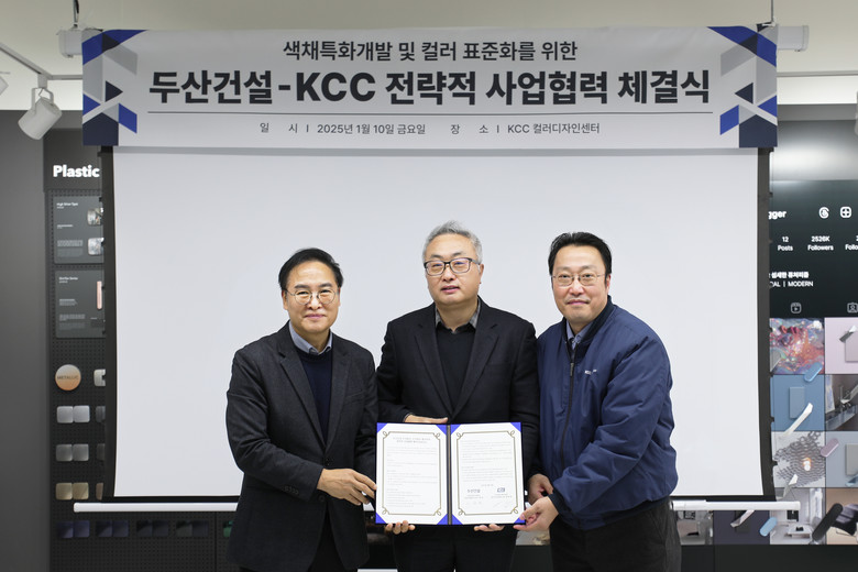 [세계타임즈 = 심귀영 기자] 두산건설(대표이사 이정환)은 지난 10일 KCC와 특화 색채 개발과 두산건설의 브랜드 컬러 표준화를 위한 MOU(업무협약)을 체결했다고 13일 밝혔다. KCC컬러디자인센터에서 진행된 협약식은 두산건설 건축사업본부 신홍철 상무, KCC컬러디자인센터 맹희재 상무, KCC 건축/플랜트/리피니쉬 사업부 함성수 상무 등 양사 관계자들이 참석한 가운데 진행됐다.