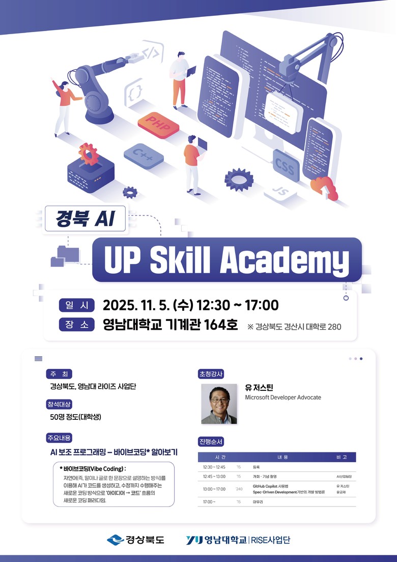 유 저스틴(Justin Yoo) 마이크로소프트 수석 개발자 아드보캇(Principal Developer Advocate)을 초청해 자동 코드 완성 인공지능인 ‘GitHub Copilot 활용법’과 ‘Spec-Driven Development(SDD) 기반 개발 방법론’을 주제로 강연을 진행했다.