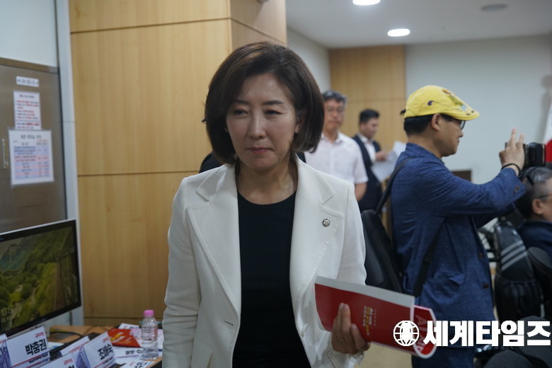 '나경원' 국민의힘 의원이 18일 서울 여의도 국회 의원회관에서 열린 AI시대, 학생 윤리 교육의 방향과 과제 토론회에 참석하고 있다.