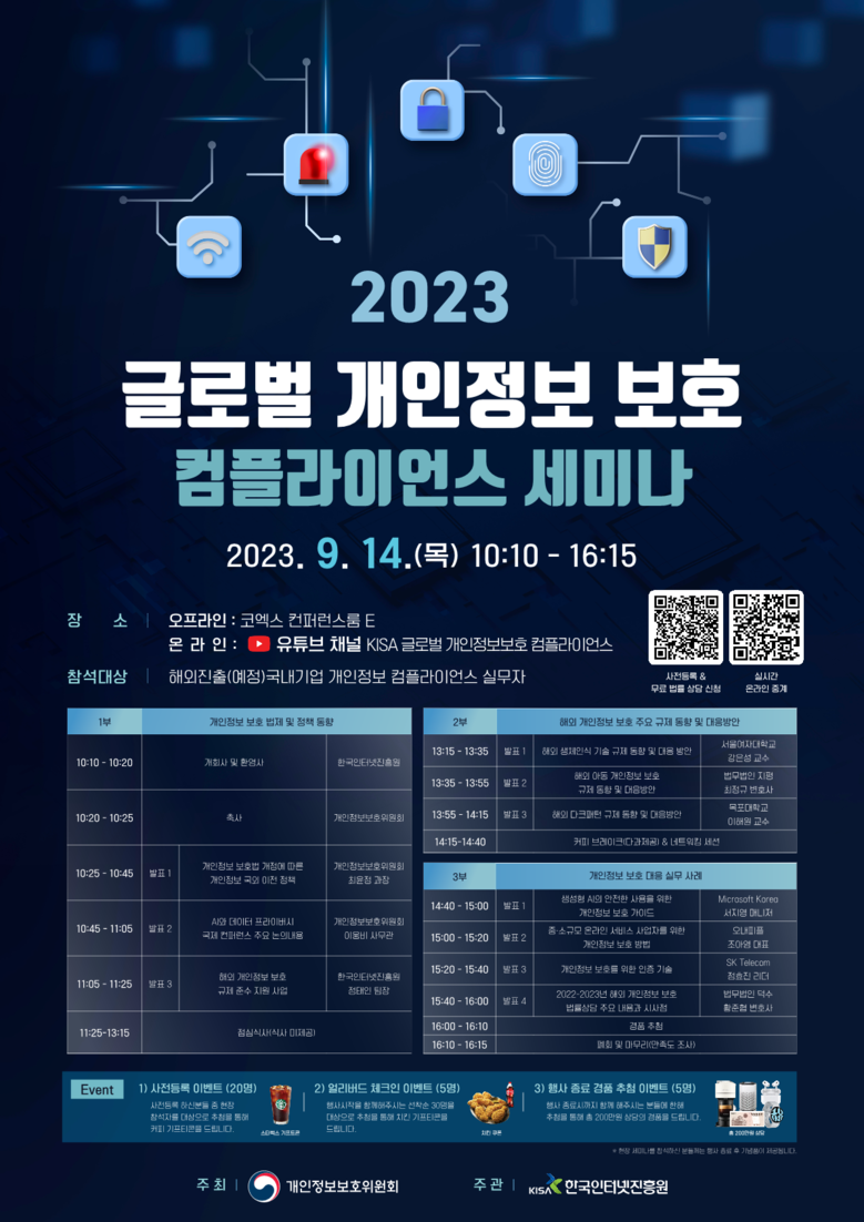 [세계타임즈 백진욱 기자] 한국인터넷진흥원(KISA, 원장 이원태)은 개인정보보호위원회(개인정보위, 위원장 고학수)와 함께 해외 개인정보 규제에 대응하는 국내 기업의 실무자를 위한 '글로벌 개인정보 보호 컴플라이언스 세미나'를 서울 코엑스에서 2023. 9. 14.(목) 개최한다고 밝혔다.