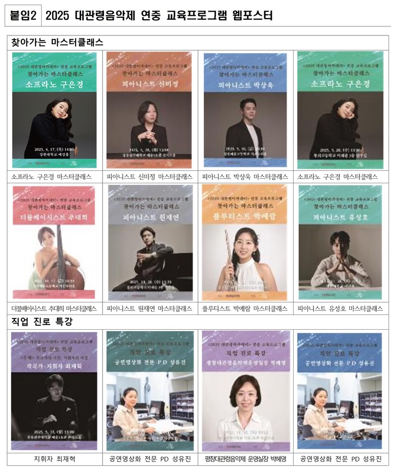 ‘찾아가는 마스터클래스’는 강원대학교, 강릉원주대학교, 강원예술고등학교, 봉의고등학교 등 총 4곳에서 진행되었다. 성악·피아노·플루트·더블베이스 등 국내외로 활동 중인 다양한 분야의 전문 연주자들이 강사로 참여해 1:1 실기 지도를 제공했다.