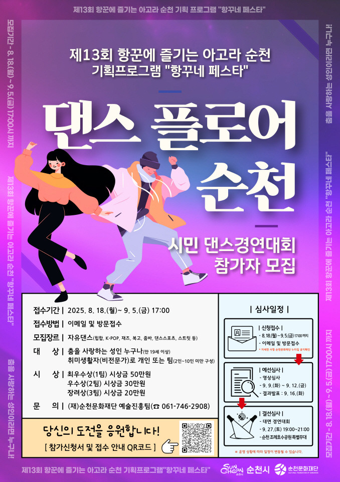 순천문화재단 관계자는“이번 경연대회는 시민 누구나 무대의 주인공이 되어 댄스를 통해 자신을 표현하고, 시민이 함께 즐길 수 있는 문화 축제를 만들고자 기획됐다”며, “무대에 서고 싶은 시민 누구나 참여할 수 있는 열린 경연인 만큼 많은 관심과 참여 바란다”고 밝혔다.