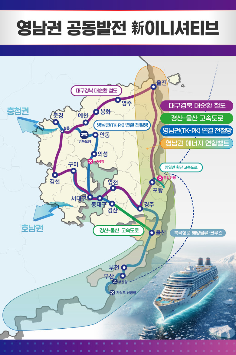 아울러 영남권 전체를 아우르는 ‘2+2 포트 전략 구상’도 제시됐다. 영남권 추가 고속도로(경산-울산 고속도로), 영남권(대구경북-부울경) 초광역 전철망 구축을 통해 영남 내륙과 해양권을 유기적으로 연결하고, 영일만항과 부산항을 북극항로 기반 해양물류와 글로벌 크루즈 관광의 복합 축으로 연계해 물류·관광·경제산업의 시너지를 극대화한다. 또 영남권 에너지 연합벨트, 미래차·이차전지 등 차세대 산업의 밸류체인을 완성하는 영남권 경제산업연합체계를 구축하여 세계와 당당히 경쟁하는 초광역 경제권으로 도약하겠다는 구상이다.