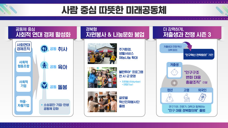 경북이 주도하는 저출생과 전쟁은 더욱 강력해진 시즌3로 확대한다. 저출생에 고령화, 청년, 외국인 정책을 종합해 미래 인구구조 변화에 선제적으로 대비해 나갈 계획이다. 여기에 더해 도민 안전을 최우선으로 산불, 산사태, 집중호우 등 3대 자연재해에 대한 대응체계를 대전환한다.