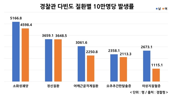 경찰청이 2016년 발표한 ‘야간특수건강검진 운영개선 및 건강실태 연구’ 보고서에 의하면 경찰관들이 빈번하게 앓는 질환은 소화성궤양, 정신질환, 어깨근골격계질환, 요추추간판탈출증(허리디스크), 이상지질혈증 등의 순으로 나타났다. 통계에서도 알 수 있듯 소화성궤양을 비롯한 스트레스성 질환과 근골격계 질환이 다발하고 있음을 확인할 수 있다.