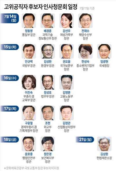 이후 17일에는 조현 외교부 장관 후보자, 김정관 산업부 장관 후보자, 구윤철 기획재정부 장관 후보자 청문회가, 18일에는 윤호중 행정안전부 장관 후보자와 정은경 보건복지부 장관 후보자 청문회가 각각 예고됐다.