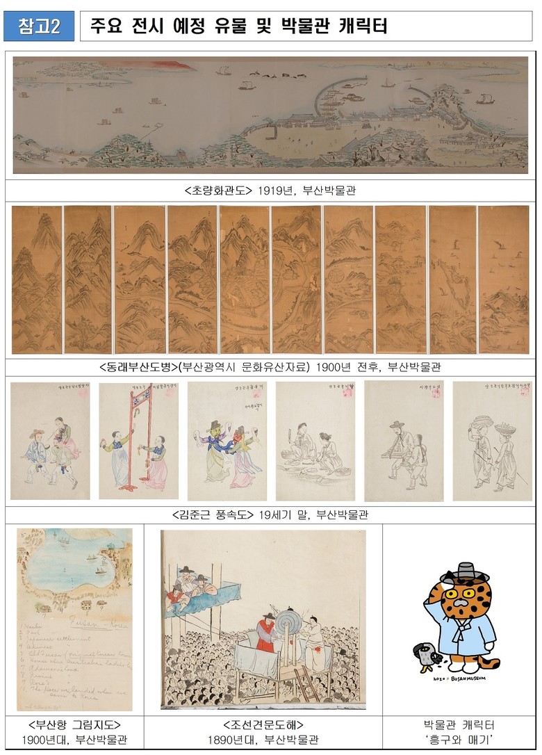 <초량화관도>, <동래부산도병>, <김준근 풍속화> 등 주요 소장 유물을 중심으로 영상 및 체험형 연출을 더 해 부산의 변화상과 그 시대를 살아온 사람들의 이야기를 흥미롭게 구성하였다.