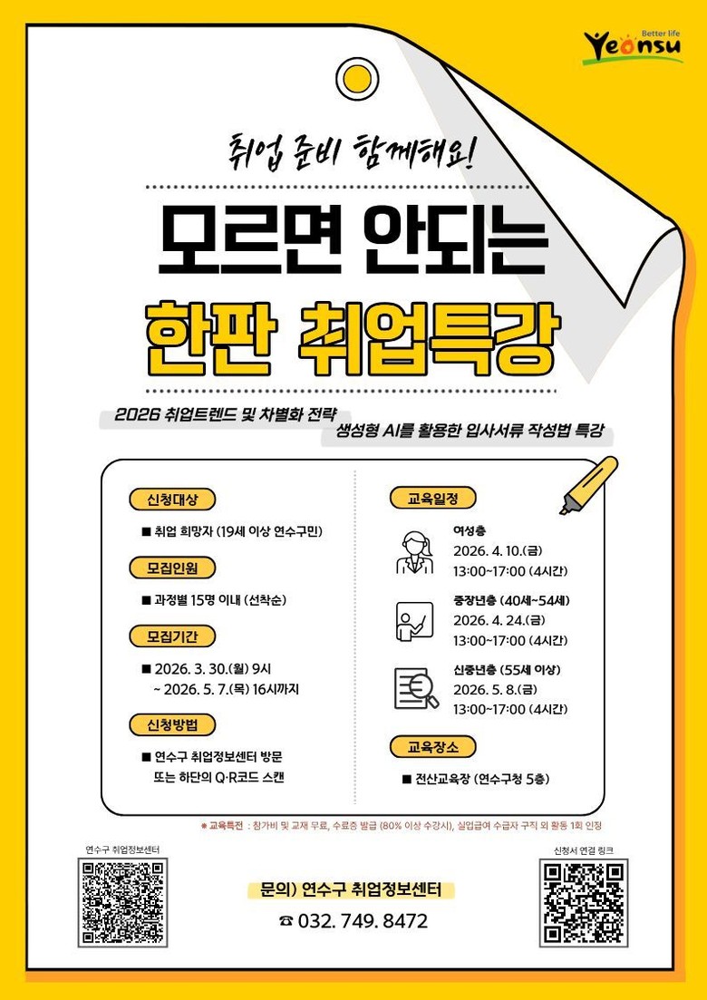 신청은 연수구 취업정보센터 방문 또는 온라인(QR코드)을 통해 가능하며, 선착순으로 마감된다. 자세한 사항은 연수구청 누리집을 참고하거나 연수구 취업정보센터(☎032-749-8472)로 문의하면 된다.