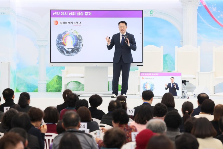 [전주=세계타임즈 = 이영임 기자] 15일 신천지예수교회 도마지파 전주교회에서 '계시 성취 실상 증거'라는 주제'로 요한계시록을 알아야 하는 이유와 목적이 성경에 기록되어 있으니 신앙인이라면 성경에 기록된 말씀을 알고 바른 신앙을 해야 한다고 강연하고 있다.