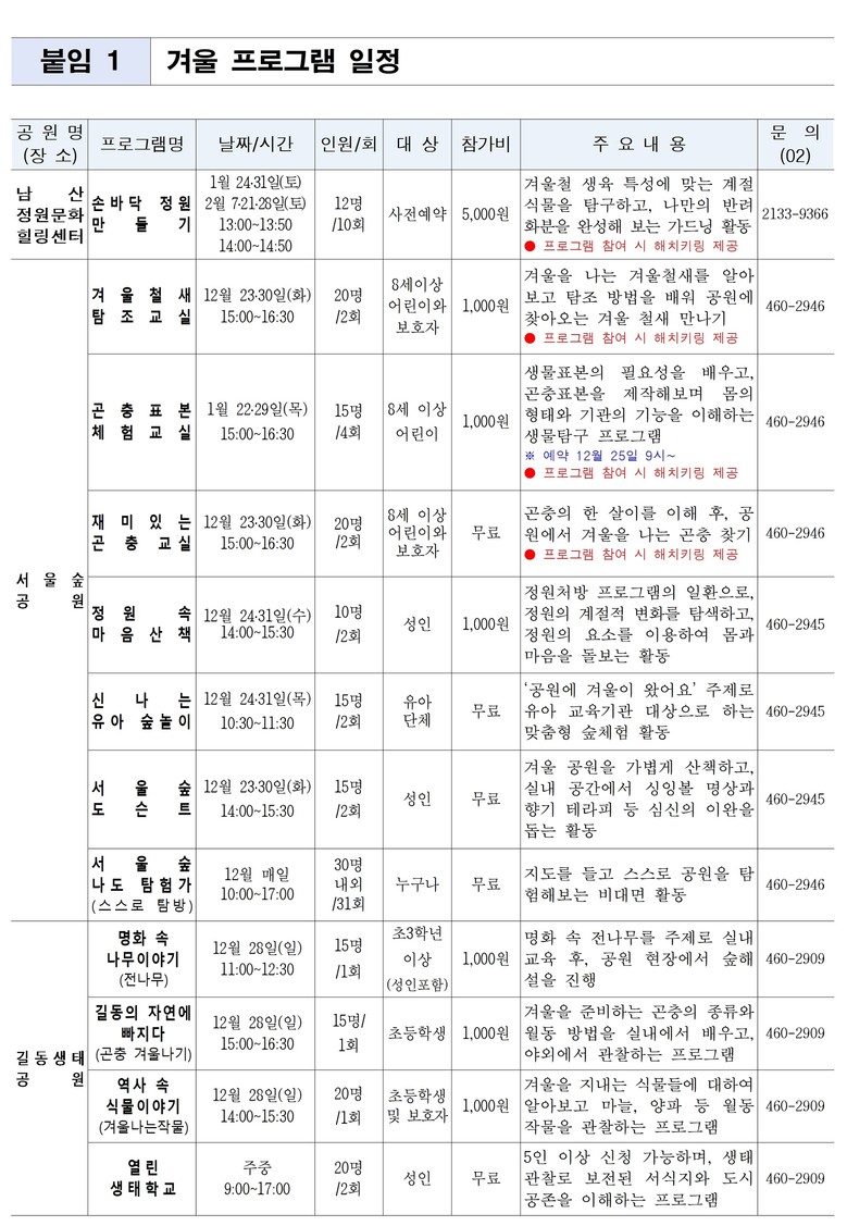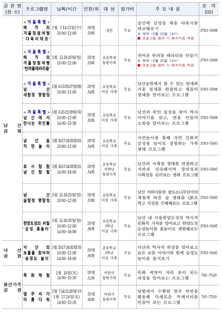 ○ 〈남산공원〉에서도 겨울방학을 맞아 남산의 숲속 새들을 관찰하며 생태 감수성을 키우는 ‘남산 새탐정 명탐정’이 1월 6/13/20/27일 4회 진행되며 진행되어 어린이들에게 흥미진진한 탐험의 시간을 선사할 예정이다.