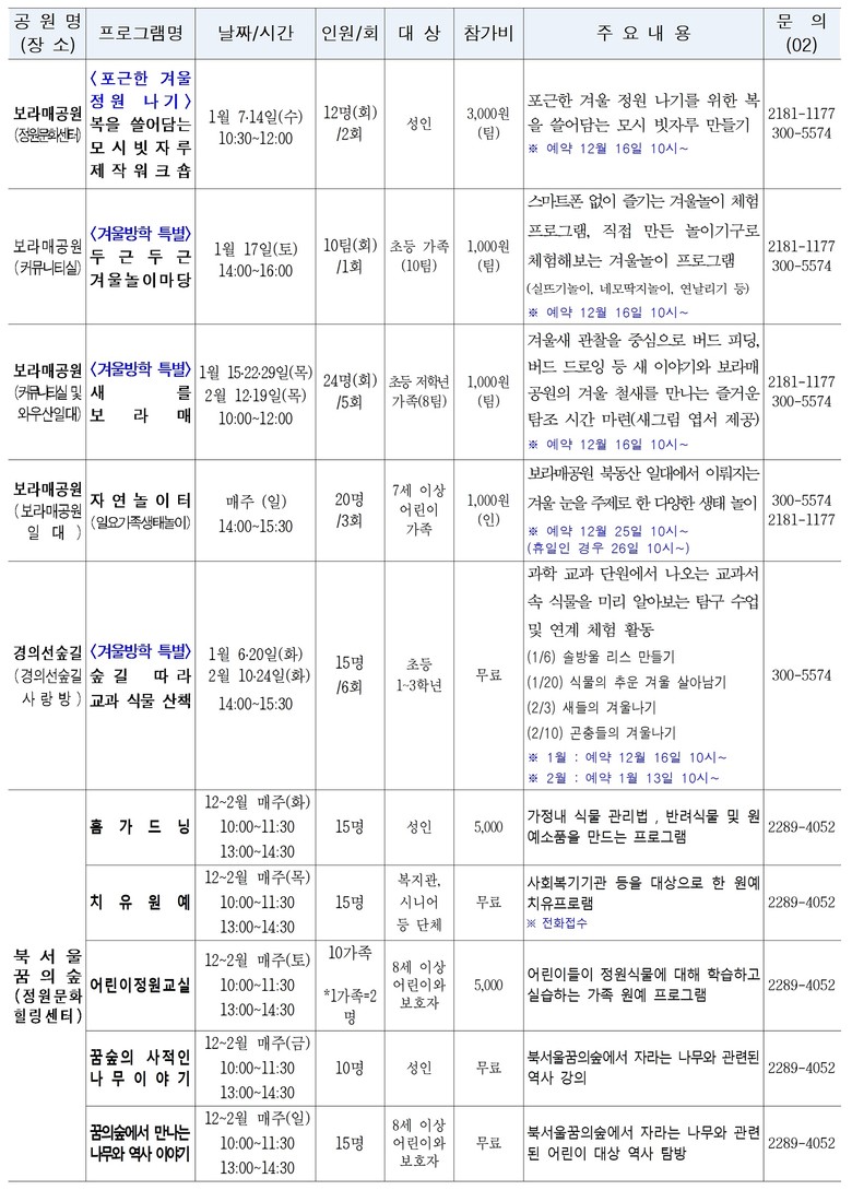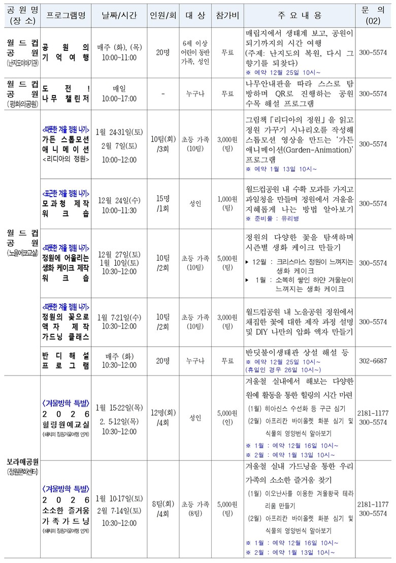 - ‘해치의 겨울정원여행’ 연계 키링 제공, 공공서비스예약 선착순 접수 [서울 세계타임즈=이장성 기자] 서울시는 다가오는 겨울방학을 맞아 서울의 공원 9곳에서 가족이 함께 즐길 수 있는 다양한 ‘겨울 공원 프로그램’ 42개를 운영한다고 밝혔다.