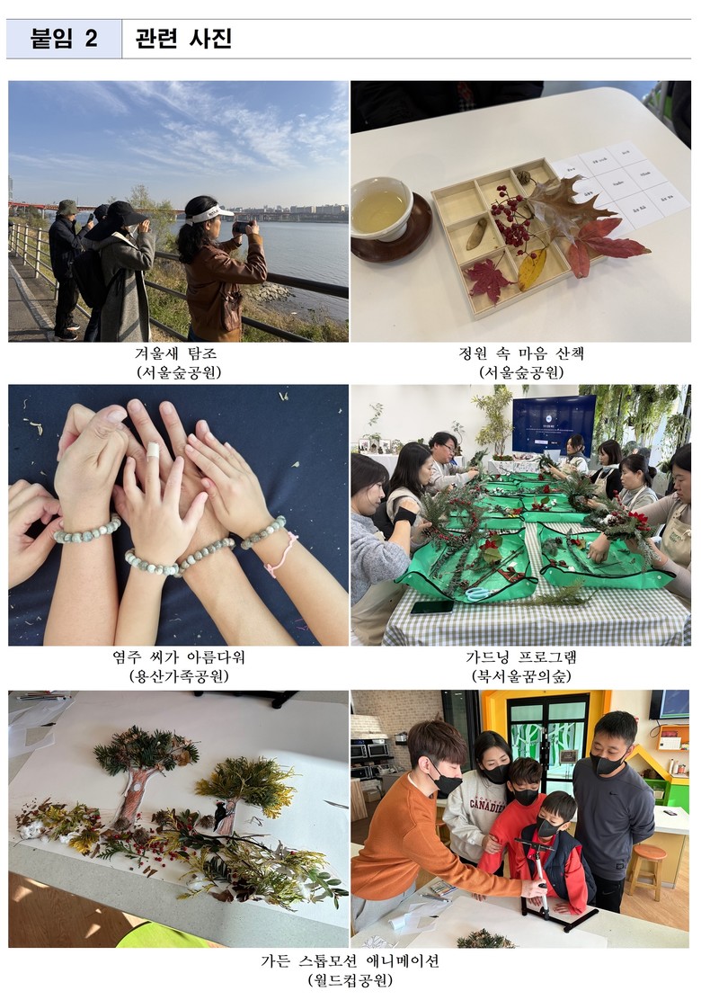 ○〈용산가족공원〉에서는 텃밭에서 수확한 염주 씨앗으로 나만의 액세서리를 만들어보는 ‘염주 씨가 아름다워’ 체험을 1월 중 6회 만나볼 수 있으며, 〈북서울꿈의숲〉에서는 정원문화힐링센터의 ‘홈가드닝’ 수업과 ‘어린이정원교실’ 수업 중 ‘나만의 크리스마스트리 만들기’ 등 계절감 있는 만들기 체험을 운영한다.