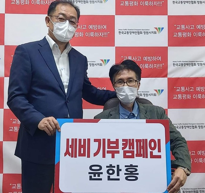 [세계타임즈 이진화 기자]창원시 마산 회원구 국민의힘 윤한홍 국회의원은 지난 17일 코로나19로 어려움을 겪고 있는 사단법인 한국교통장애인협회창원시지회(회장홍민식)에 작은 힘을 보태고자 국회의원 세비 기부 캠페인 일환으로 100만원을 기부해 훈훈함을 전했다.