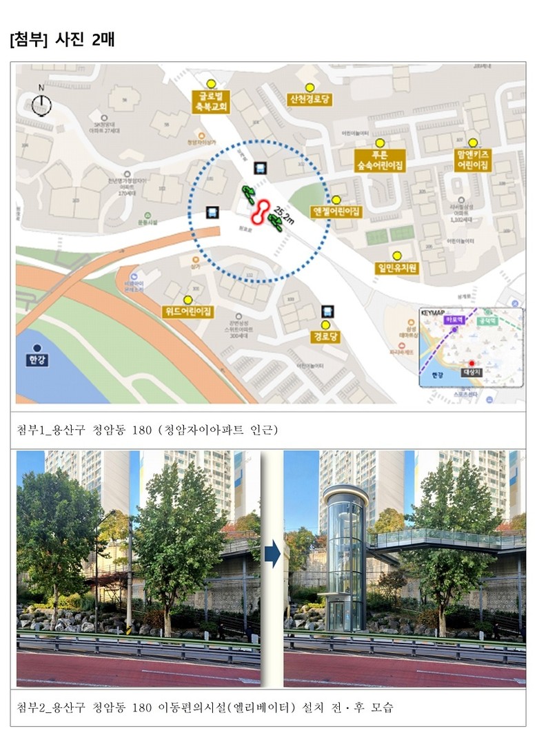 원효로4가 청암동 일대는 경사도가 높고 계단과 급경사 보행로가 혼재해 고령자와 장애인, 어린이 등 이동약자의 통행 불편이 지속적으로 제기되어 온 지역이다. 특히 버스정류장과 주거 밀집지역, 초등학교, 상가 및 한강공원 접근 동선이 맞물려 있어 생활 이동권 보장의 필요성이 컸다.