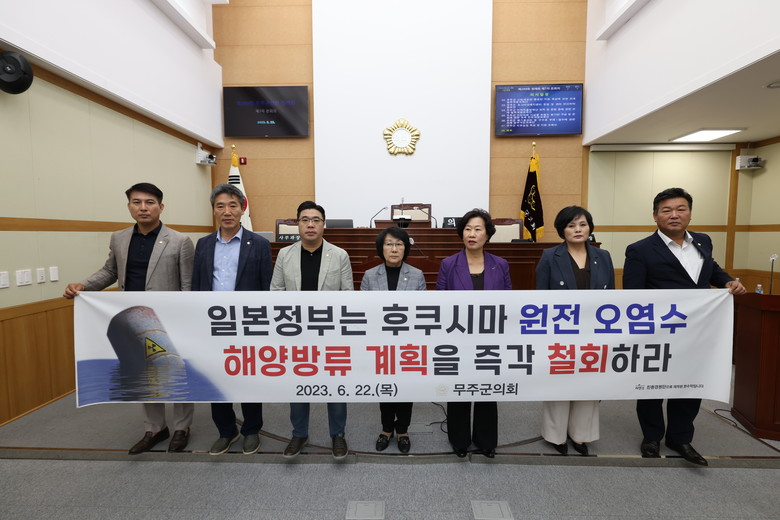 무주군의회는 결의문을 통해 ▲일본 정부는 전세계 해양 생태계를 위협하는 방사능 오염수 해양 방류를 즉각 철회할 것 ▲일본 정부는 후쿠시마 원전 오염수 시설에 대한 세계정부 조사단의 실질적이고 명확한 조사를 받고 정보를 투명하게 공개할 것 ▲국민의 안전과 건강을 위해 원전 오염수 해양방류 결정이 철회되도록 대한민국 정부가 적극 대응할 것을 촉구했다.