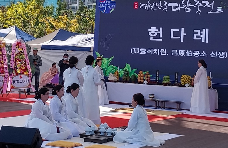 10.21(금) 경남연구원에서 개최한 ‘한‧케냐 학술심포지엄’에 이어 10.22(토)에는 고운 최치원 선생과 창원백 공소선생 헌다례, 입⸱퇴장, 복장, 절모습, 행다례, 차마시기 등의 예절 모습을 심사평가로 하는 전국어린이차예절경연대회, 차의 혼합비, 조리과정, 아름다운 셋팅과 미각, 실용성 등을 평가하는 전국차음식요리경연대회, 다도구 상차림, 차의 맛과 다식, 예절법도, 찻자리 연출, 관련 의상을 평가하는 전국찻자리경연대회, 그리고 올해부터 또 새롭게 시도하는 제1회 차시공모전 및 당선作시 낭송대회가 열렸다.