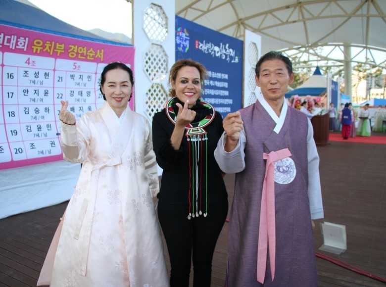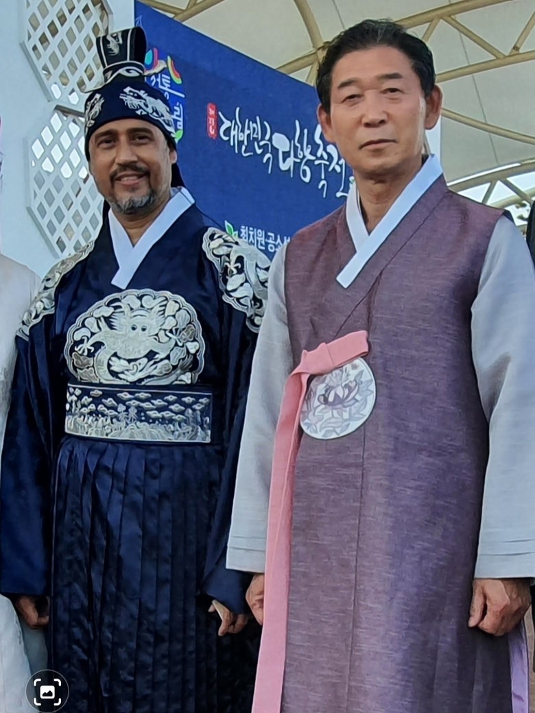 사진은:『제23회 대한민국다향축전』에서 좌측~~ 미잔라흐만 방글라데시 상무관 이 고성배 회장과 전통 궁중한복을 입고 차인들에게 선보였다.