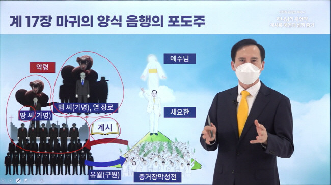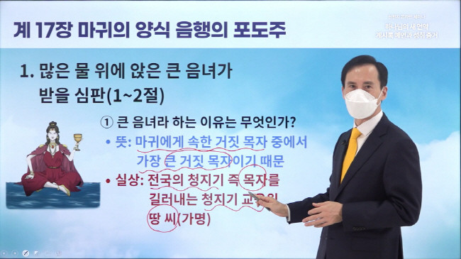 (6일 오전 신천지예수교회의 ‘하나님의 새 언약 계시록 예언과 성취 증거’ 세미나에서 이승주 시몬지파장의 요한계시록 17장 강의가 유튜브에서 실시간 스트리밍되고 있다)