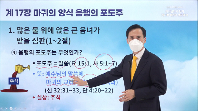 이 지파장은 “계시록 17장은 (계시록 16장에서)일곱 금 대접으로 배도자와 멸망자를 심판했던 일곱 천사 중 하나가 ‘큰 음녀의 받을 심판’과 그 음녀가 주는 ‘음행의 포도주’로 만국이 미혹됐음을 알리는 내용”이라며 “이 예언은 이미 진행돼 오늘날 이뤄진 사건”이라고 말했다.