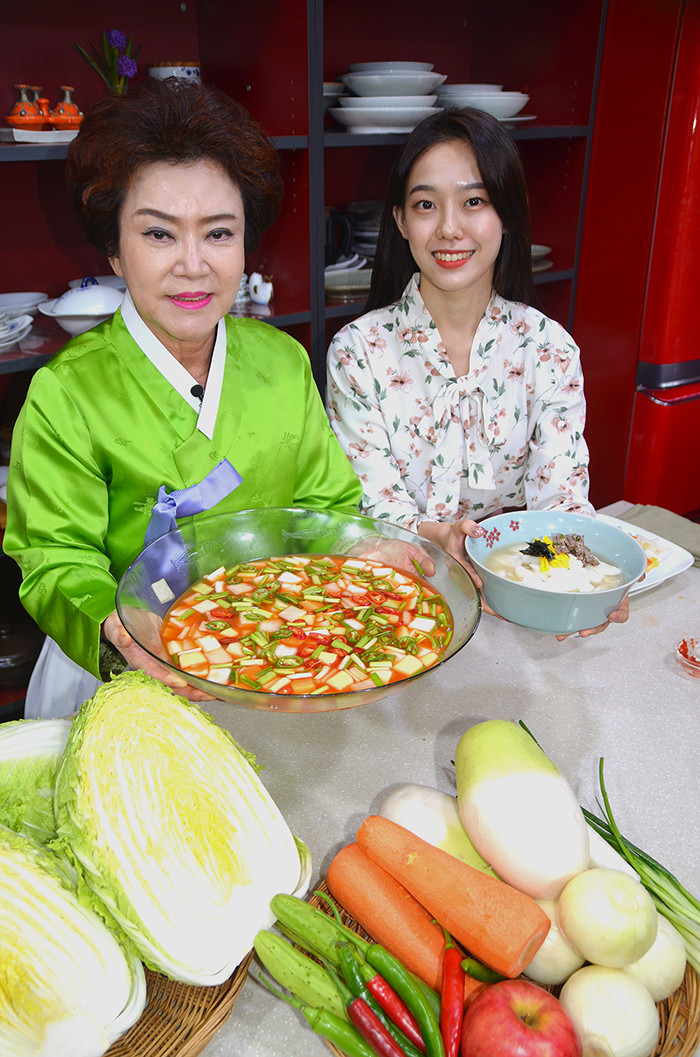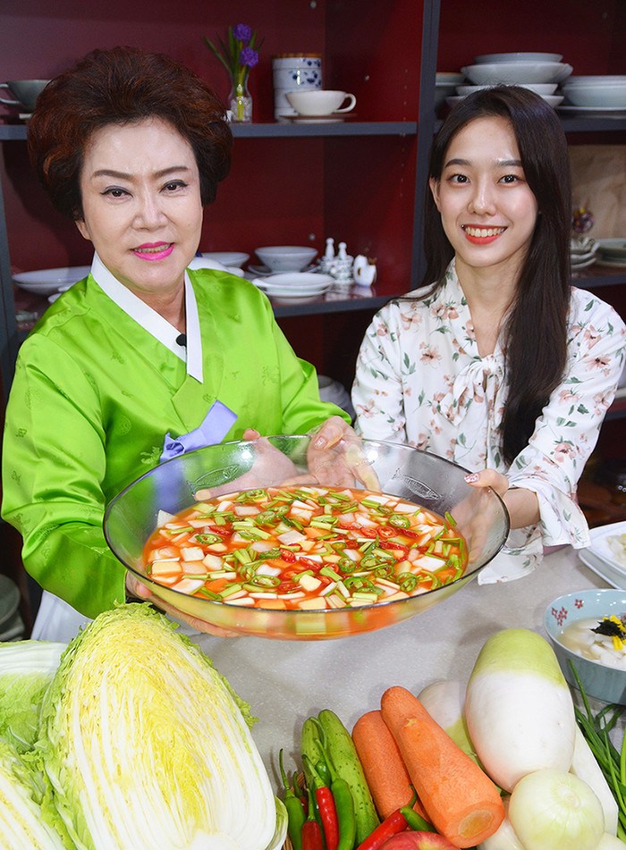 | ▲“깔끔한 나박김치와 봄철에 먹기 좋은 봄동김치 먹어보세요~” 김치명인 김순자 대표와 모델이 17일 경기도 부천 한성식품 본사에서 직접 만든 나박김치와 봄동김치를 선보이고 있다. 김순자 대표는 나박김치의 재료인 무가 소화 효소를 지니고 있어 남녀노소 누구나 즐길 수 있는 김치라고 설명했다. |