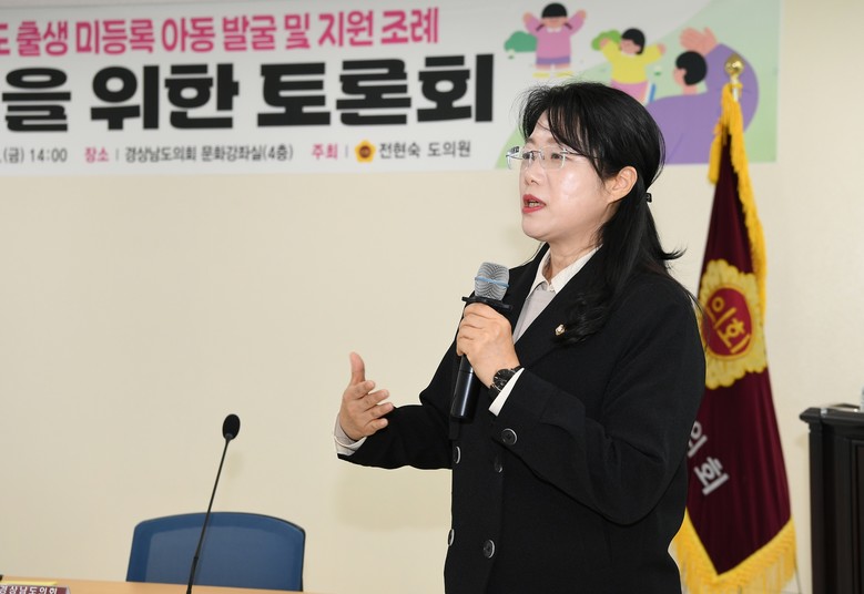 [경남 세계타임즈=최성룡 기자] 경상남도의회 전현숙 의원(국민의힘, 교육위원회)은 31일 도의회 문화강좌실에서 「경상남도 출생 미등록 아동 발굴 및 지원 조례」 제정을 위한 토론회를 개최했다.