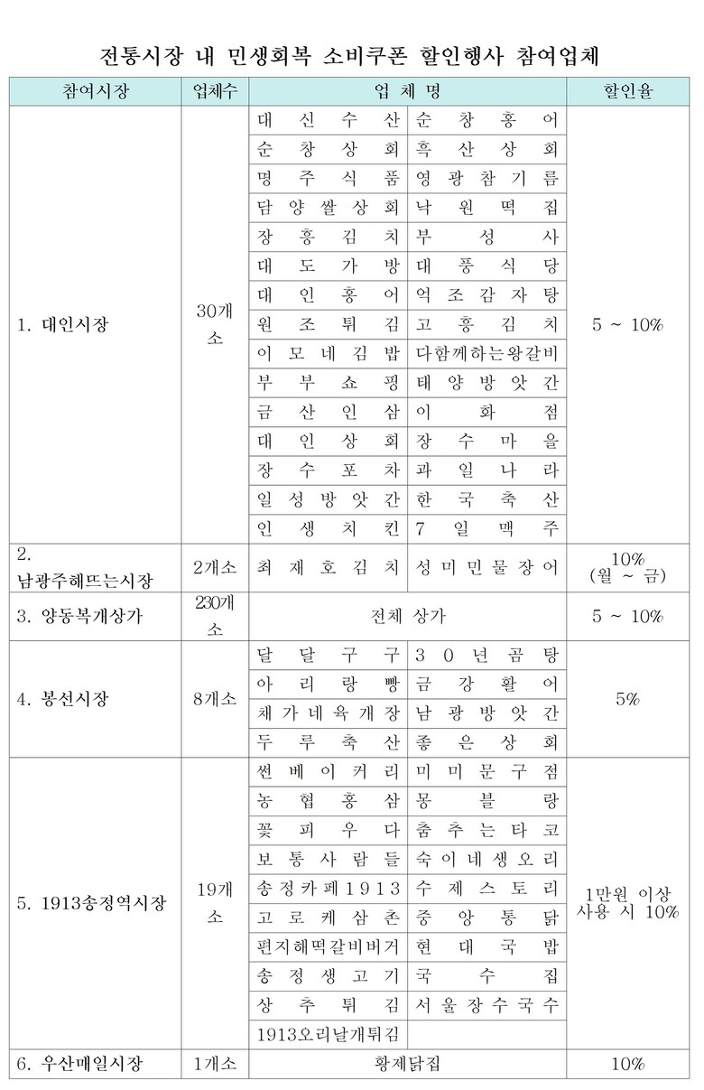 참여시장은 ▲대인시장 ▲남광주해뜨는시장 ▲양동복개상가 ▲봉선시장 ▲1913송정역시장 ▲우산매일시장 6곳이다. 단 시장별 참여업체와 할인율은 차이가 있다.