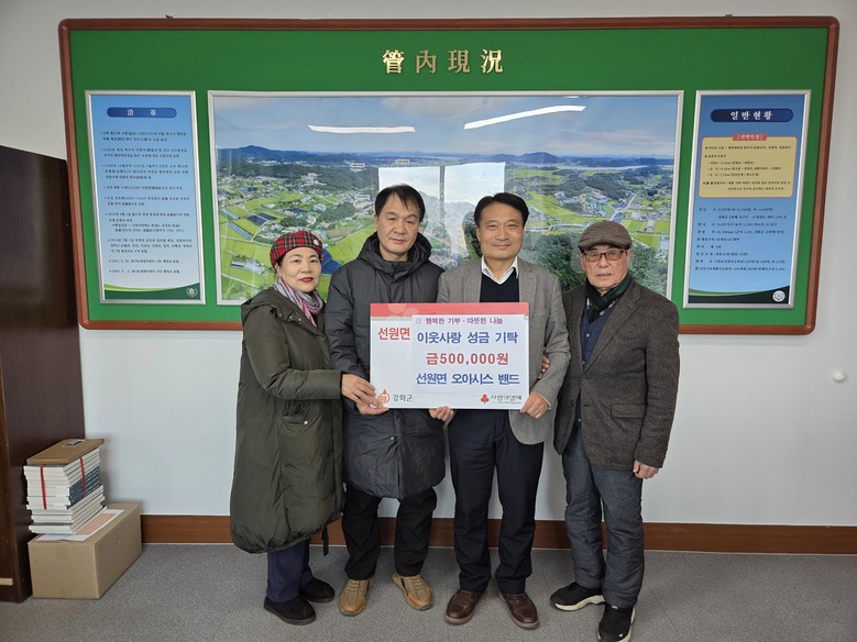 [강화군 세계타임즈=심하린 기자] 강화군 선원면(면장 이정실)은 지난 22일, 선원면 오아시스 밴드(단장 표경호)에서 면사무소를 방문해 도움이 필요한 이웃을 위해 사용해 달라며 성금 50만 원을 기탁했다고 전했다.